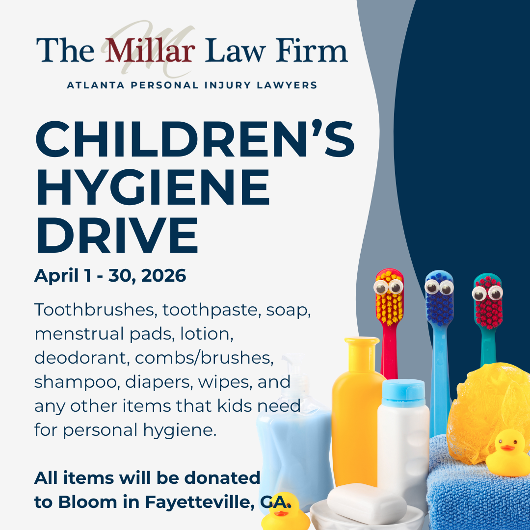 From April 1 – 30, 2026, The Millar Law Firm will be collecting children’s hygiene items. This includes toothbrushes, toothpaste, soap, menstrual pads (*no tampons), lotion, deodorant, combs/brushes, shampoo, diapers, wipes, and any other items that kids need for personal hygiene. All items will be donated to Bloom in Fayetteville.